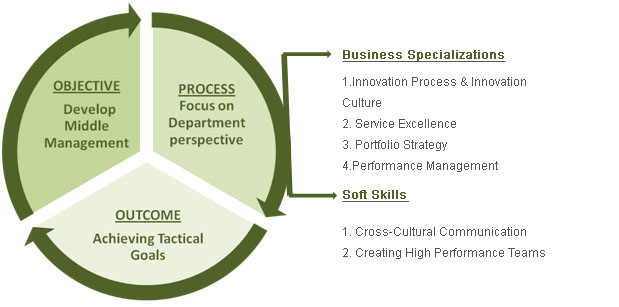 Management Development Programs aim to help middle level managers improve their decision making ability, manage growth in the mid-term and enhance people management skills. Management Development programs focus on the business specializations (e.g. Innovation process, Service Excellence, Portfolio Management, etc) and soft skills programs like cross-cultural communication, negotiation and building high-performance teams.
